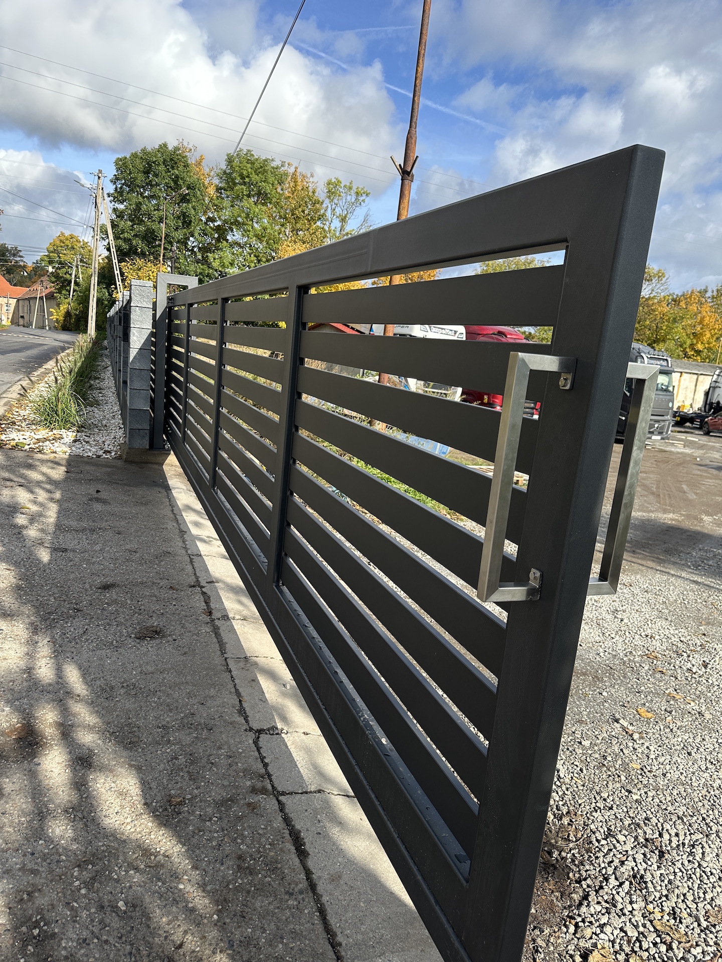 Brama wykonana techniką laserową profile ze stali ocynkowanej malowanej proszkowo w dowolnym kolorze RAL wybranym przez klienta.